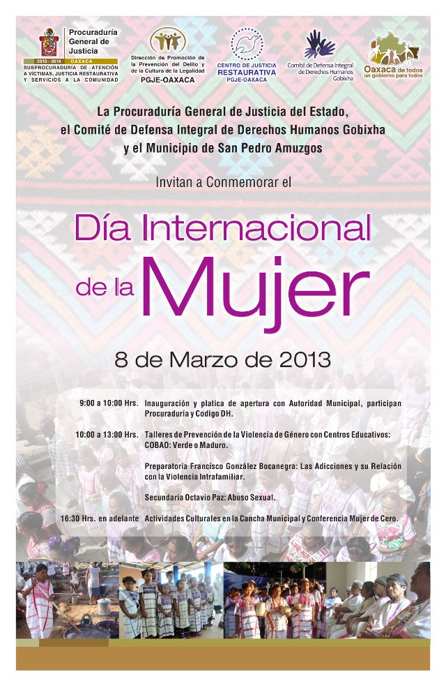 La oficina de San Pedro Amuzgos de CODIGO DH, organiza conjuntamente con las autoridades municipales y la Subprocuraduría de Atención a Víctimas, un programa de actividades para acercar información sobre Prevención de la Violencia contra las Mujeres, abuso sexual a centros escolares y público en general en el municipio de San Pedro Amuzgos.